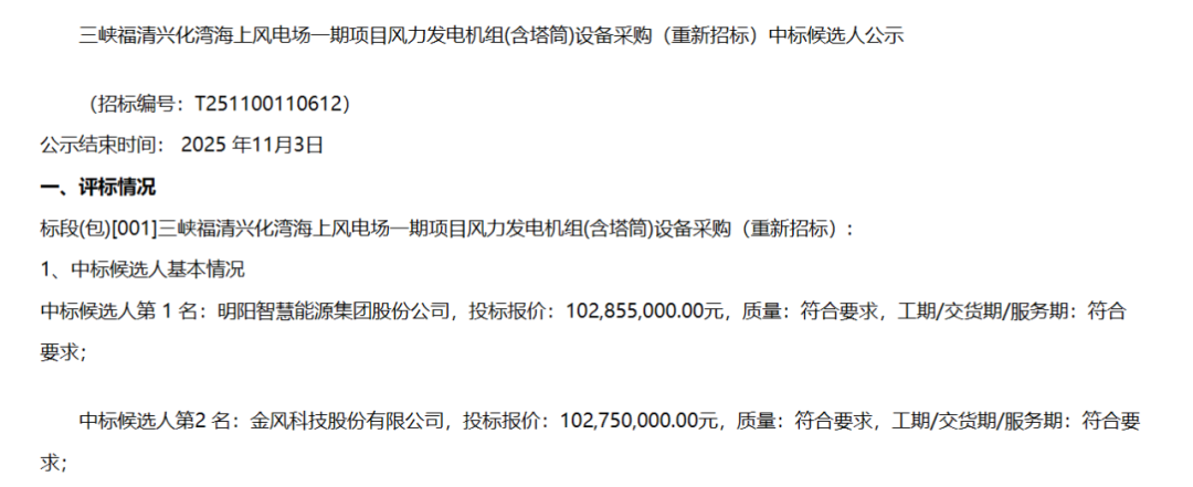 北极星风力发电网获悉,10月31日,三峡福清兴化湾海上风电场一期项目风力发电机组(含塔筒)设备采购(重新招标)中标候选人公示。根据公示,第一中标候选人为明阳智能,投标报价为1.02855亿元,折合单价为6857元/kW。三峡福清兴化湾海上风...