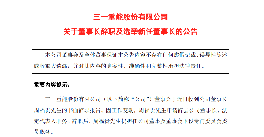 11月1日,三一重能发布公告称,董事会于近日收到公司董事长周福贵先生的书面辞职报告。因工作变动,周福贵先生申请辞去公司董事长、法定代表人职务。辞职后,周福贵先生仍担任公司董事及董事会下设专门委员会委员职务。三一重能于10月31日召开第二届董...