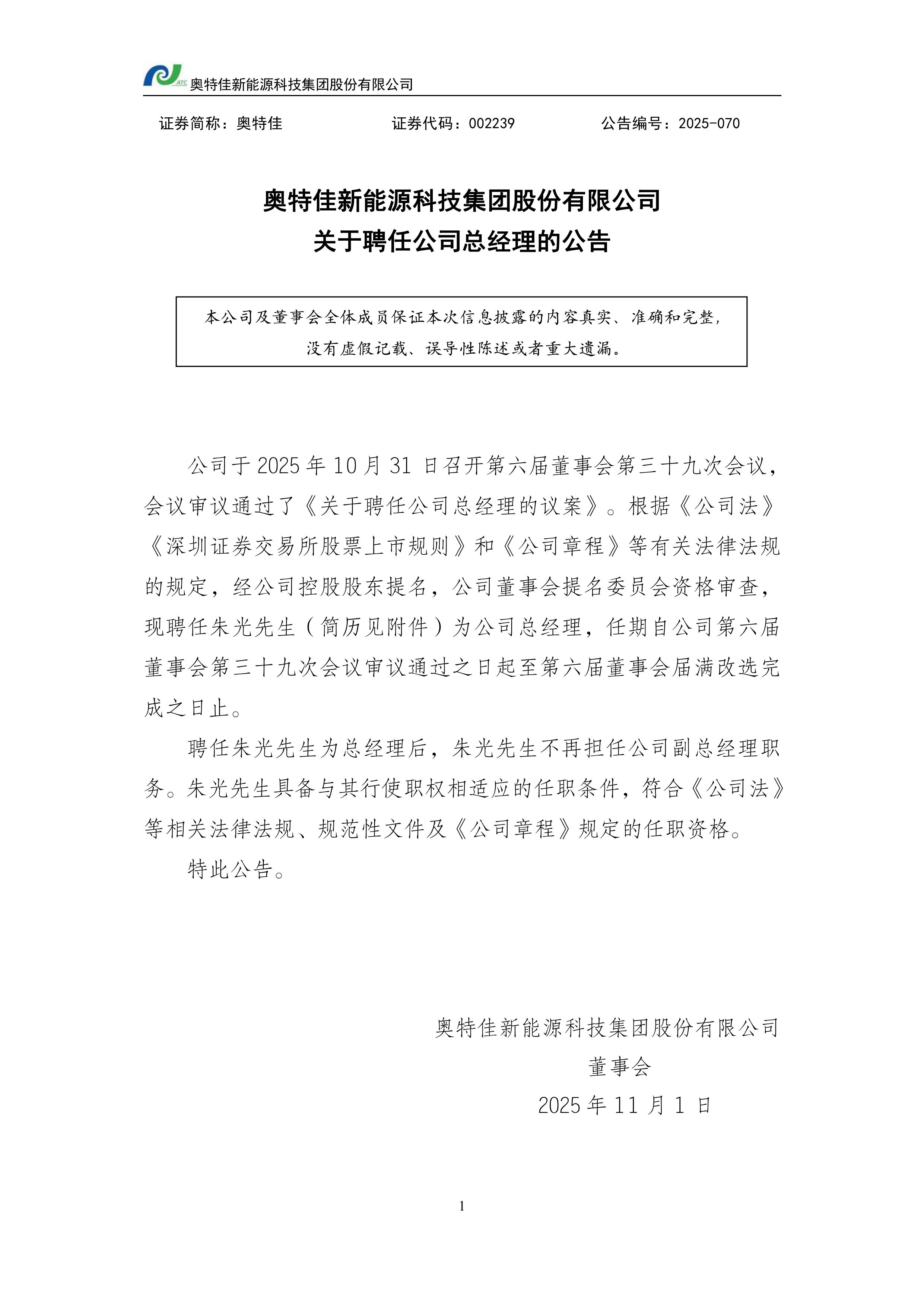 10月31日,奥特佳新能源科技集团股份有限公司发布“关于聘任公司总经理的公告”。公告称,公司于2025年10月31日召开第六届董事会第三十九次会议,会议审议通过了《关于聘任公司总经理的议案》,现聘任朱光先生为公司总经理,任期自公司第六届董事...