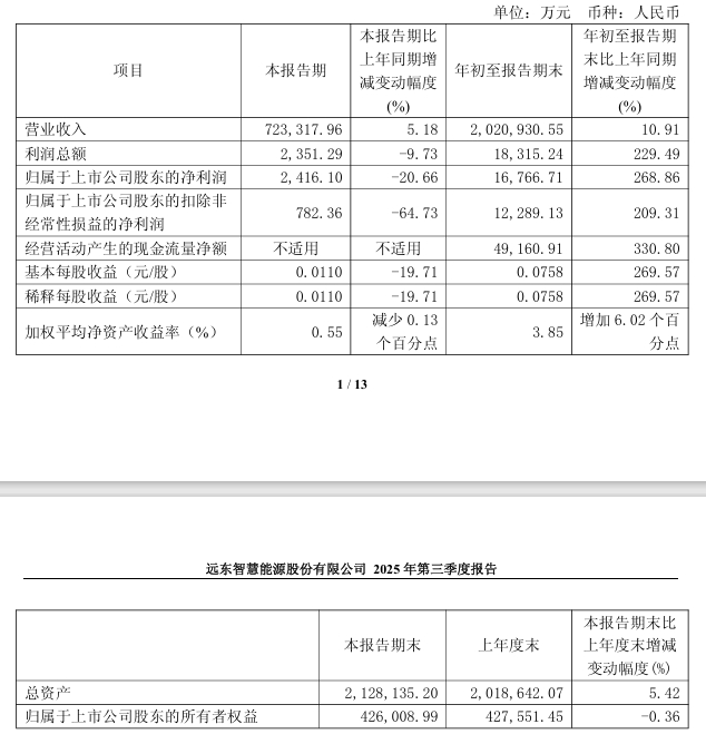 近日,远东智慧能源股份有限公司发布2025年第三季度报告。前三季度,公司实现营业收入202.09亿元,同比增长10.91%;归母净利润1.68亿元,同比增长268.86%。第三季度单季度实现营业收入72.33亿元,同比增长5.18%;归母净...