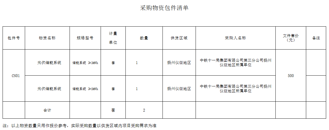 中铁十一局集团第三分公司于10月30日发布“2025-2026年度扬州仪征地区光伏储能系统框架协议采购公告”,该区域项目光伏储能系统公开招标。本次采购范围为江苏扬州仪征地区所需光伏储能系统,包括1套≥3MWh和1套≥5MWh规格产品,公告所...