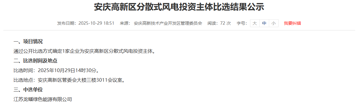 北极星风力发电网获悉,近日,安庆高新区分散式风电投资主体比选结果公示。根据公示,该项目中选企业为江苏龙蟠绿色能源有限公司。根据比选公告,该项目位于安庆市高新区。主要建设内容:分散式风电及配套设施,规划容量37.5MW(以最终正式批复的规模为...