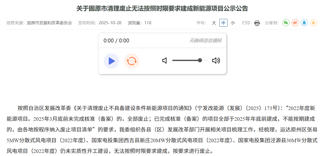 北极星风力发电网获悉,10月28日,固原市发展和改革委员会发布关于固原市清理废止无法按照时限要求建成新能源项目公示公告。公告显示,经梳理,运达原州区张易5MW分散式风电项目(2022年度)、国家电投集团西吉县新庄20MW分散式风电项目(20...