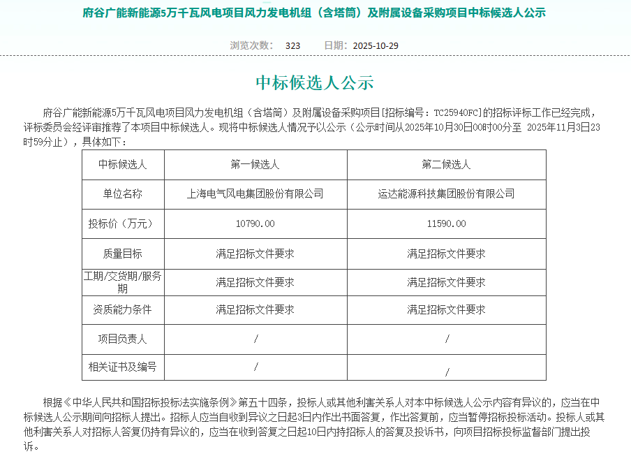 北极星风力发电网获悉,10月29日,府谷广能新能源5万千瓦风电项目风力发电机组(含塔筒)及附属设备采购开标:电气风电为第一中标候选人,报价1.079亿元。根据招标公告,该项目位于陕西省榆林市府谷县南部,总装机容量为50MW,安装8台单机容量...