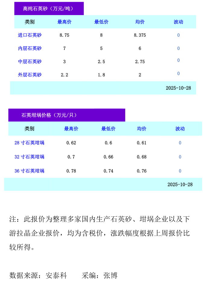 10月28日,硅业分会发布高纯石英砂/石英坩埚价格。...