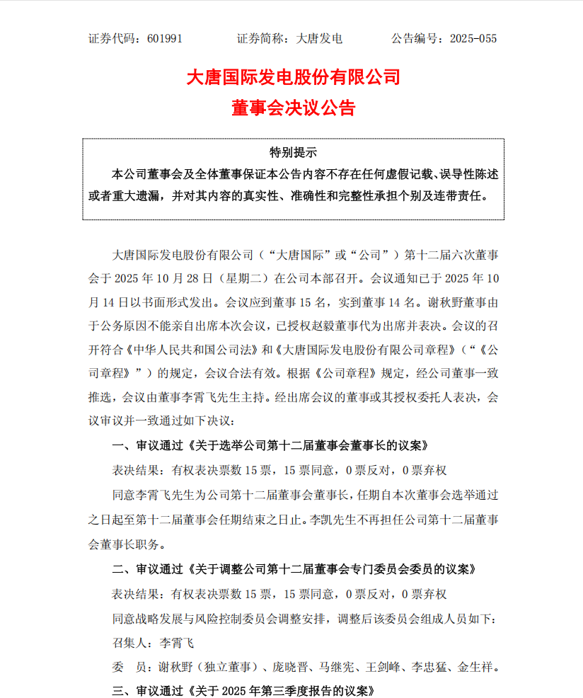 10月28日,大唐发电召开董事会,审议通过《关于选举公司第十二届董事会董事长的议案》,同意李霄飞先生为公司第十二届董事会董事长,任期自本次董事会选举通过之日起至第十二届董事会任期结束之日止。李凯先生不再担任公司第十二届董事会董事长职务。战略...