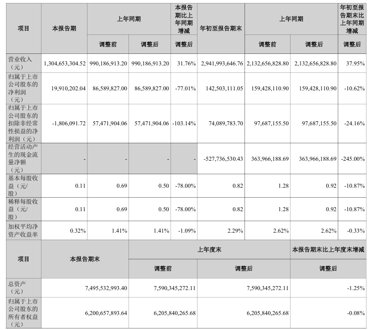 2025年10月29日,华宝新能发布2025年第三季度报告。财务数据显示,第三季度公司实现营业收入13.05亿元,同比增长31.76%;归属于上市公司股东的净利润1991.02万元,同比下降77.01%。前三季度,公司营收29.42亿元,同...