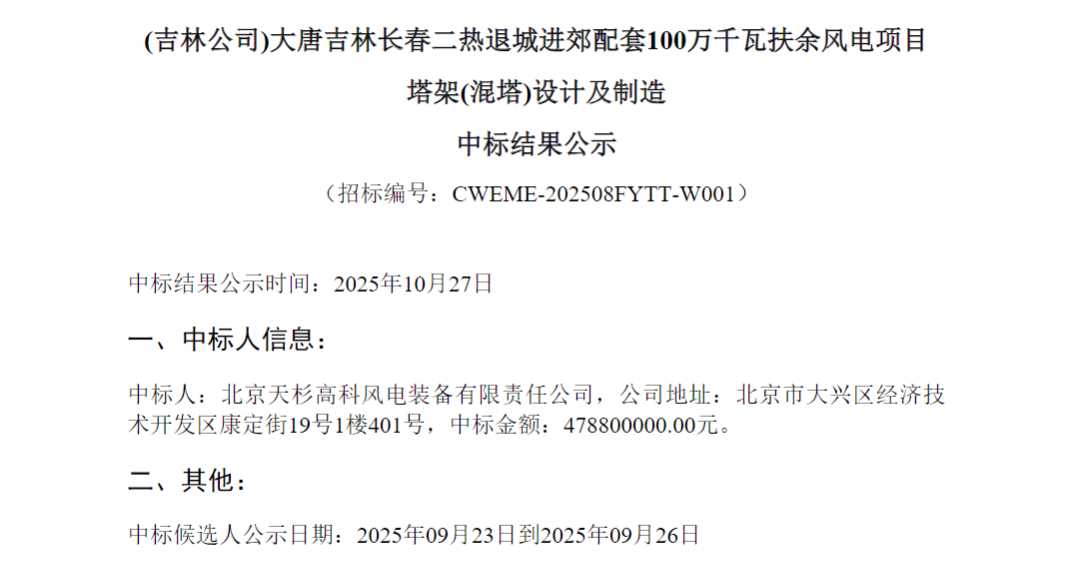 10月27日,大唐吉林长春二热退城进郊配套100万千瓦扶余风电项目塔架(混塔)设计及制造中标结果公示。根据公示,该项目中标人为北京天杉高科风电装备有限责任公司,中标金额为4.788亿元。此前招标公告显示,大唐吉林长春二热“退城进郊”配套10...