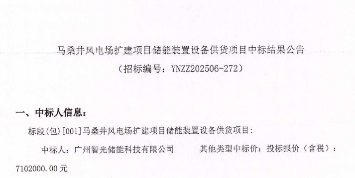 北极星储能网获悉,10月24日,马桑井风电场扩建项目储能装置设备供货项目中标结果公告,广州智光储能科技有限公司以710.2万元中标该项目,折合单价0.7102元/Wh。据此前发布的中标候选人公示,广州智光储能科技有限公司报价710.2万元为...