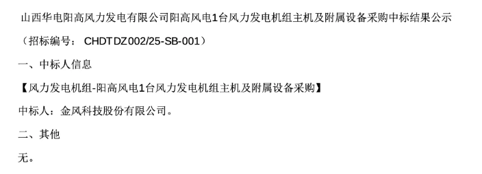 日前,山西华电阳高风力发电有限公司阳高风电1台风力发电机组主机及附属设备采购中标结果揭晓:金风科技中标。据悉,本次招标的是1台2MW风电机组设备。详情如下:此前公示显示,金风科技投标报价:855.00万元,有效业绩8项,满足资格条件业绩数量...