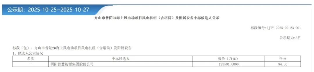 北极星风力发电网获悉,10月24日,浙能集团舟山市普陀2#海上风电场项目风电机组(含塔筒)及附属设备中标候选人公示,明阳智能预中标,报价:123501.6000万元。舟山市普陀2#海上风电场项目位于舟山市普陀区六横岛东南侧海域,场址中心离岸...