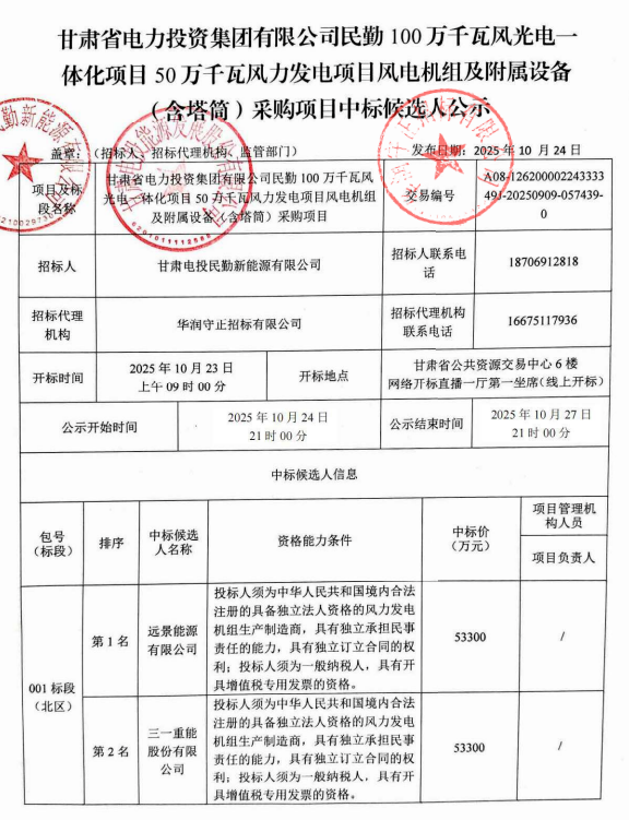 北极星风力发电网获悉,10月24日,甘肃省电力投资集团有限公司民勤100万千瓦风光电一体化项目50万千瓦风力发电项目风电机组及附属设备(含塔筒)采购项目中标候选人公布。001标段(北区):第一中标候选人:远景能源有限公司,中标价:53300...