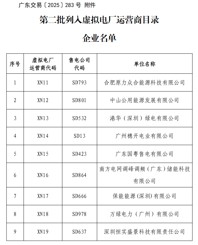 北极星电力市场网获悉,近日,广东电力交易中心公布第二批列入虚拟电厂运营商目录企业名单,广东电力交易中心对9家虚拟电厂运营商市场准入申请材料进行了公示,公示期为2025年9月23日至2025年10月22日。公示期间,收到关于万绿电力(广州)有...