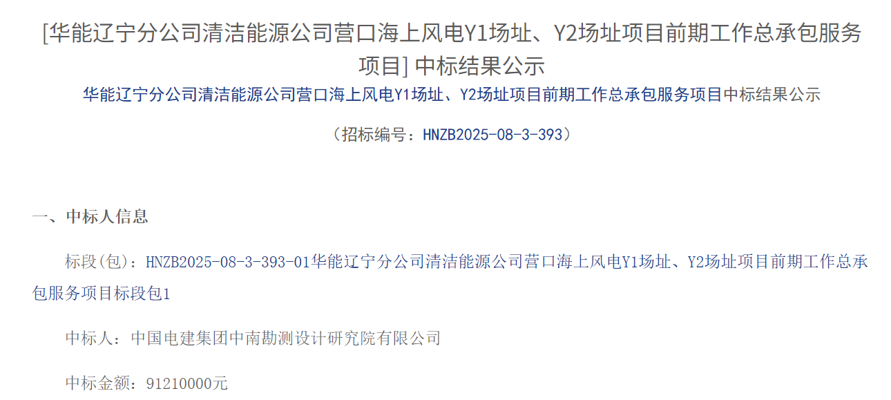 10月22日,华能辽宁分公司清洁能源公司营口海上风电Y1场址、Y2场址项目前期工作总承包服务项目中标结果公示。公告显示,中国电建集团中南勘测设计研究院有限公司成功中标该项目,中标价格为91210000元。华能营口海上风电Y1场址、Y2场址项...