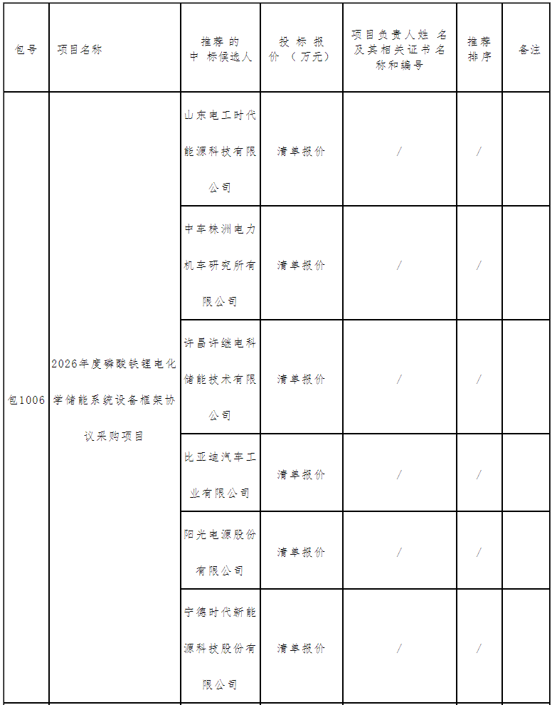 北极星储能网讯:2026年1月6日,中国绿发投资集团公示了2026年度磷酸铁锂电化学储能系统集采的中标候选人,入围企业包含山东电工时代能源科技有限公司、中车株洲电力机车研究所有限公司、许昌许继电科储能技术有限公司、比亚迪汽车工业有限公司、阳...