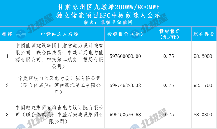 北极星储能网获悉,1月7日,甘肃省凉州区九墩滩200MW/800MWh独立储能项目EPC中标候选人公示,第一名为中国能建甘肃院、中建五局电力能源有限公司、中交第二航务工程局有限公司组成的联合体,总投标报价约5.976亿元,单价约为0.747...