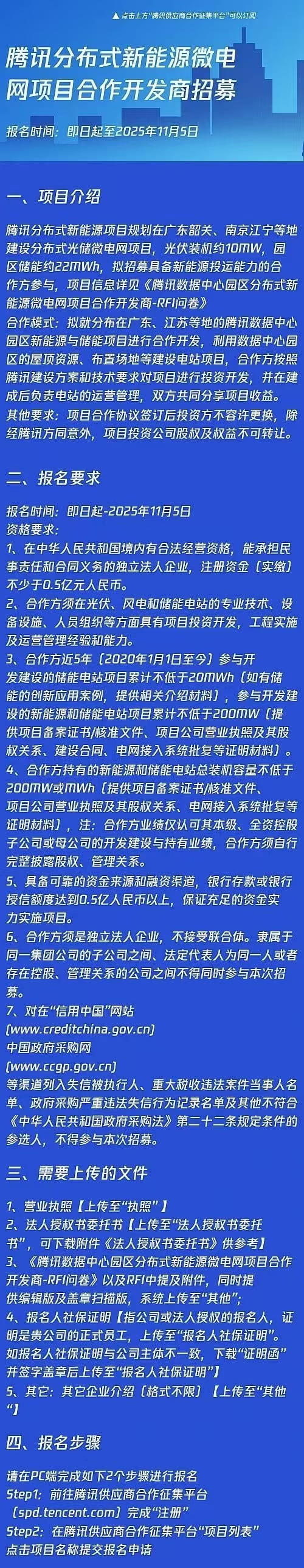 10月22日,腾讯供应商合作征集平台发文“腾讯分布式新能源微电网项目合作开发商招募”。据介绍,腾讯分布式新能源项目规划在广东韶关、南京江宁等地建设分布式光储微电网项目,光伏装机约10MW,园区储能约22MWh,拟招募具备新能源投运能力的合作...