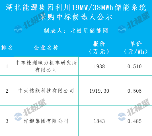 北极星储能网获悉,10月23日,湖北能源集团利川建南19MW/38MWh储能系统设备采购中标候选人公示。第一中标候选人为中车株洲电力机车研究所有限公司,投标报价1938万元,折合单价0.510元/Wh。第二中标候选人为中天储能科技有限公司,...