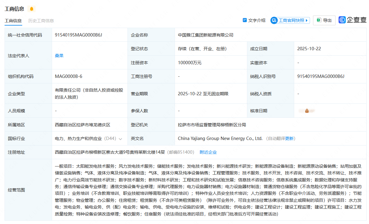 北极星储能网从企查查获悉,10月22日,中国雅江集团新能源有限公司成立,法定代表人为桑果,注册资本10亿人民币,经营范围含太阳能发电技术服务、风力发电技术服务、储能技术服务、发电技术服务、新兴能源技术研发、新能源原动设备制造、新能源原动设备...