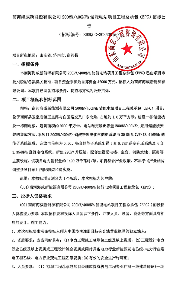 10月23日,商河海威新能源有限公司200MW/400MWh储能电站项目工程总承包(EPC)招标公告发布。项目位于山东省济南市商河县,本项目200MW/400MWh磷酸铁锂电化学储能系统由20套6.7MW/13.416MWh储能子系统组成。...