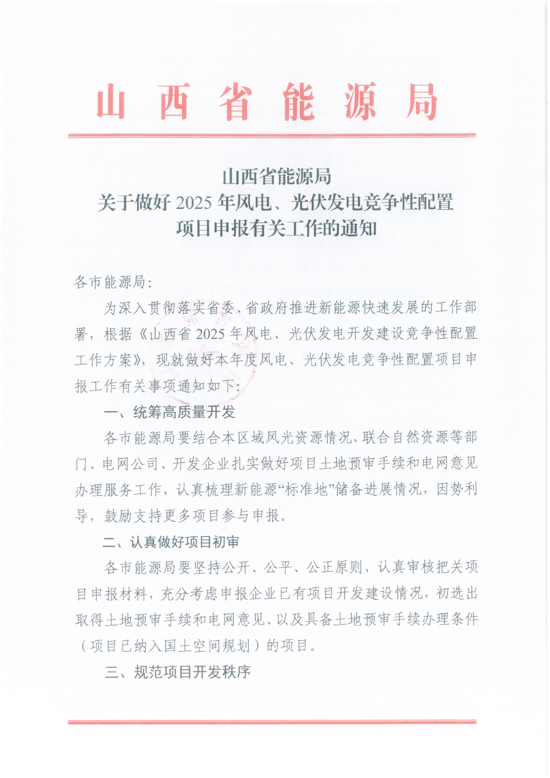 风芒能源获悉,10月20日,山西省能源局印发《关于做好2025年风电、光伏发电竞争性配置项目申报有关工作的通知》。通知指出,各市能源局要结合本区域风光资源情况,联合自然资源等部门、电网公司、开发企业扎实做好项目土地预审手续和电网意见办理服务...