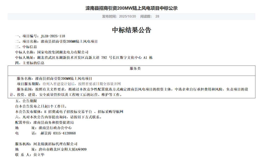北极星风力发电网获悉,10月20日,河北滦南县招商引资200MW陆上风电项目中标公示。根据公示,该项目中标人为国家电投集团湖北电力有限公司。相关招标公告显示,滦南县招商引资200MW陆上风电项目实施地点位于滦南县扒齿港镇、青坨营镇等区域内选...