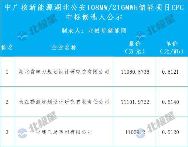 北极星储能网获悉,10月20日,中广核新能源湖北公安108MW216MWh储能项目EPC总承包施工采购中标候选人公示。第一中标候选人为湖北省电力规划设计研究院有限公司,投标报价11060.5736万元,折合单价0.5121元/Wh;第二中标...