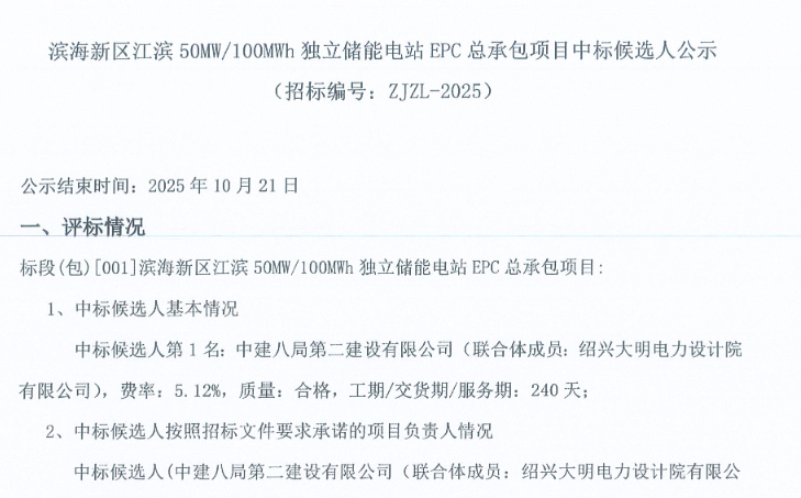 北极星储能网获悉,10月16日,绍兴滨海新区滨耀储能有限公司发布滨海新区江滨50MW/100MWh独立储能电站EPC总承包项目中标候选人公示。中标候选人第一名为中建八局第二建设有限公司(联合体成员:绍兴大明电力设计院有限公司),投标费率5....