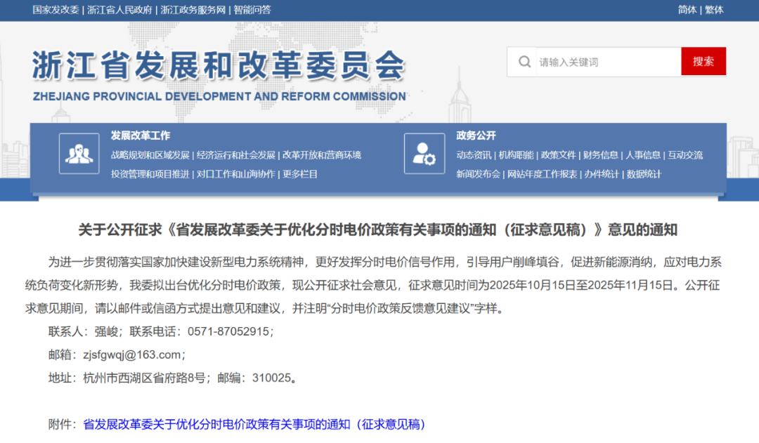 10月15日,浙江省发改委发布《关于优化分时电价政策有关事项的通知(征求意见稿)》。分时调整加上浮动调整,对于工商业储能峰谷套利收益有较大影响,经初步计算,收益减少约30%。通知指出:为衔接电力市场交易,将工商业分时电价计价基数调整为上网电...
