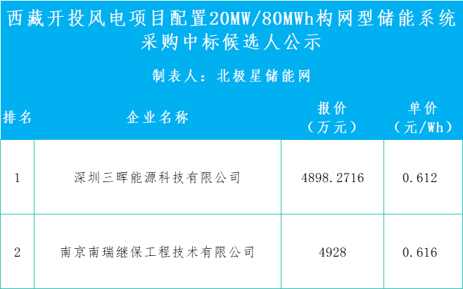 北极星储能网获悉,10月16日,西藏开投昌都市卡若区约巴乡10万千瓦风电项目(配置储能)20MW180MWh构网型储能系统成套装置设备采购中标候选人公示。第一中标候选人为深圳三晖能源科技有限公司,投标报价4898.2716万元,折合单价0....