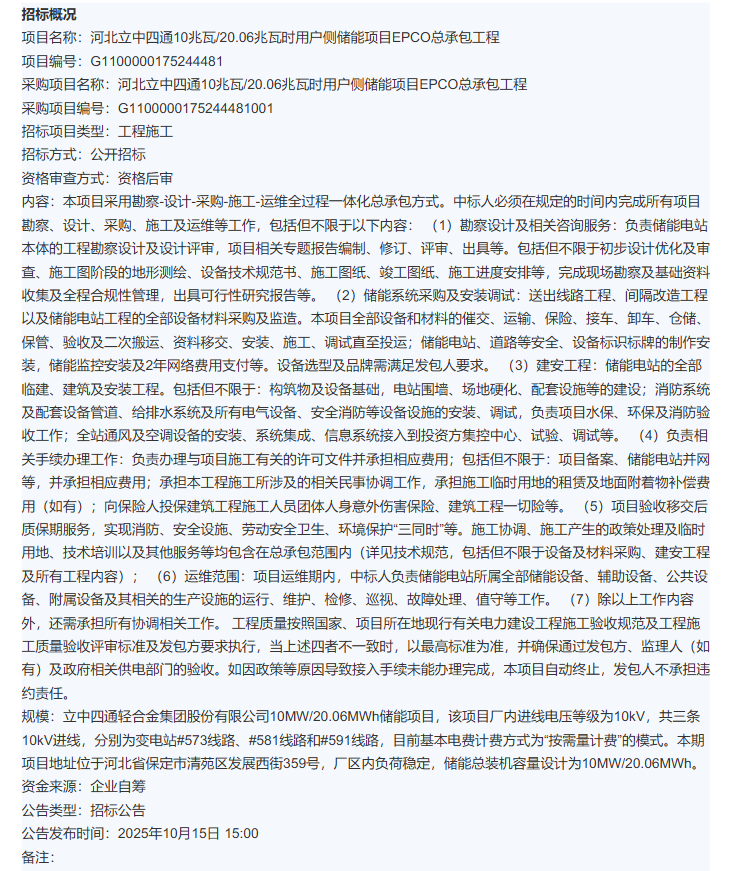 北极星储能网获悉,10月15日,中开新能源(深圳)有限公司发布河北立中四通10兆瓦/20.06兆瓦时用户侧储能项目EPCO总承包工程招标公告,本项目采用勘察-设计-采购-施工-运维全过程一体化总承包方式。中标人必须在规定的时间内完成所有项目...