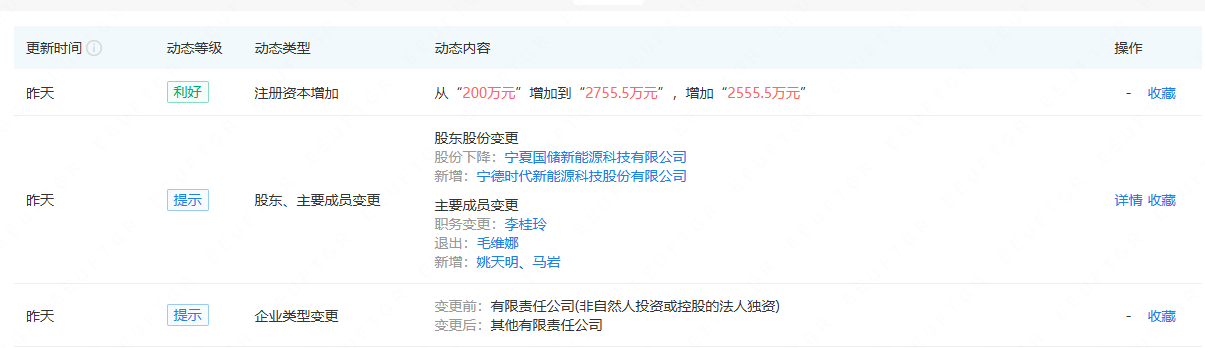 北极星储能网从企查查获悉,10月15日,吴忠市聚能科技有限公司发生工商变更,新增宁德时代为股东,同时注册资本由200万元增至2755.5万元。企查查信息显示,该公司成立于2022年,法定代表人为李桂玲,经营范围包含:光伏发电设备租赁;充电桩...