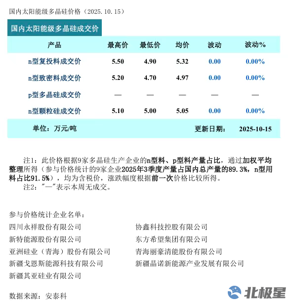 10月15日,硅业分会公布最新多晶硅价格。据安泰科统计,本周多晶硅n型复投料成交价格区间为4.9-5.5万元/吨,成交均价为5.32万元/吨,环比持平。n型颗粒硅成交价格区间为5.0-5.1万元/吨,成交均价为5.05万元/吨,环比持平。本...