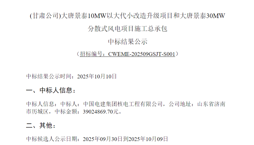 【(甘肃公司)大唐景泰10MW以大代小改造升级项目和大唐景泰30MW分散式风电项目施工总承包】中标结果公示项目概况与招标范围项目名称:(甘肃公司)大唐景泰10MW以大代小改造升级项目和大唐景泰30MW分散式风电项目施工总承包建设地点:甘肃省...