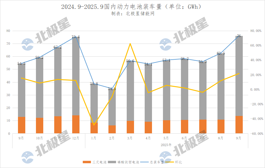 北极星储能网获悉,10月14日,中国汽车动力电池产业创新联盟发布2025年9月动力电池月度信息。9月,我国动力电池装车量76.0GWh,环比增长21.6%,同比增长39.5%。其中三元电池装车量13.8GWh,占总装车量18.2%,环比增长...