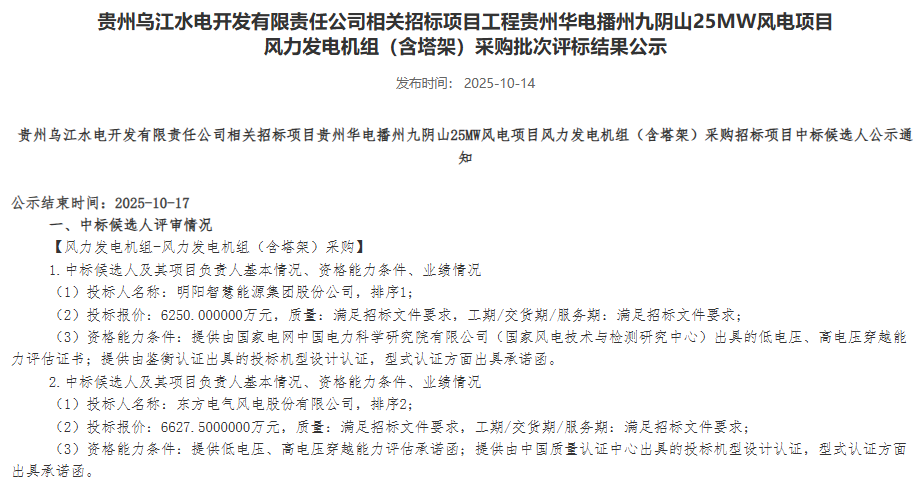 北极星风力发电网获悉,10月14日,华电集团发布《贵州华电播州九阴山25MW风电项目风力发电机组(含塔架)采购批次评标结果公示》。《公示》显示,该项目中标候选人第一名为明阳智能,投标报价为6250万元。据悉,该项目位于贵州省遵义市播州区乐山...