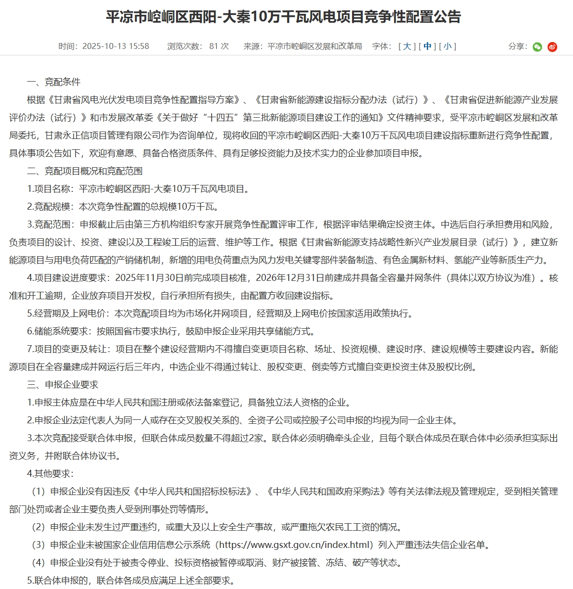 北极星风力发电网获悉,10月13日,甘肃省平凉市崆峒区人民政府发布《平凉市崆峒区西阳-大秦10万千瓦风电项目竞争性配置公告》。《公告》称,本次竞配项目名称:平凉市崆峒区西阳-大秦10万千瓦风电项目,总规模10万千瓦。竞配范围:申报截止后由第...