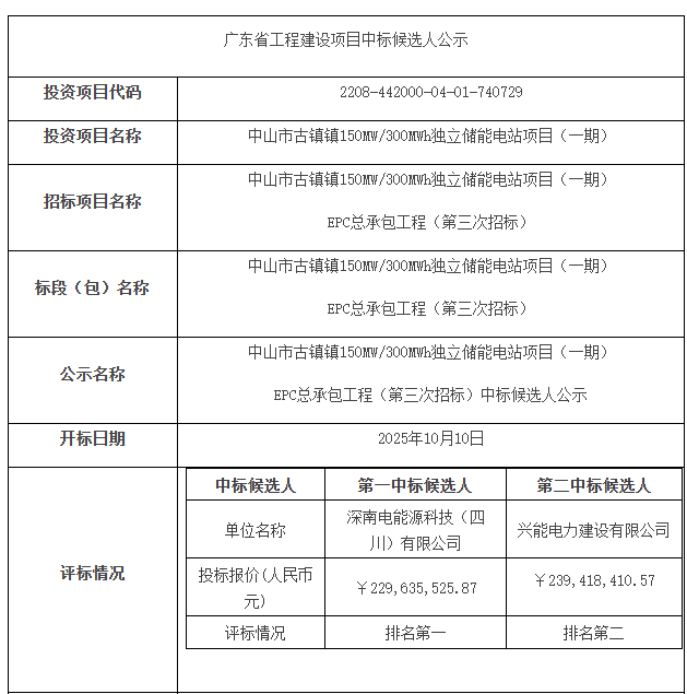 北极星储能网获悉,10月14日,电投(中山)智慧能源有限公司发布中山市古镇镇150MW/300MWh独立储能电站项目(一期)EPC总承包工程(第三次招标)中标候选人公示。项目位于广东省中山市古镇镇,储能电站采用预制舱方案,一期标称容量为10...