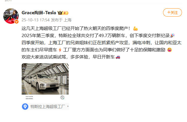 北极星储能网获悉,10月13日,特斯拉全球副总裁陶琳在微博发帖称,上海超级工厂已经开始了热火朝天的四季度爬产。陶琳表示,2025年第三季度,特斯拉全球共交付了49.7万辆新车,创下季度交付新纪录。与此同时,陶琳在同日发布的另一条微博称:“特...