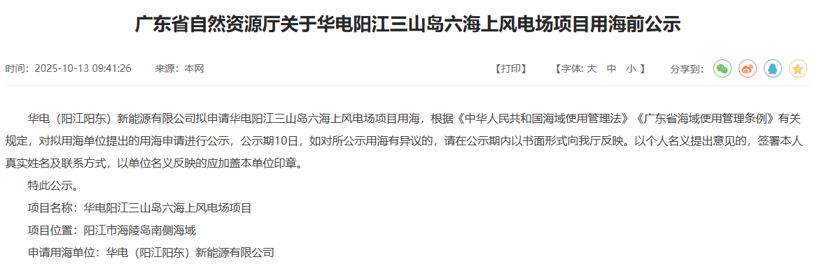 北极星风力发电网获悉,10月13日,广东省自然资源厅发布《关于华电阳江三山岛六海上风电场项目用海前公示》。项目名称:华电阳江三山岛六海上风电场项目项目位置:阳江市海陵岛南侧海域申请用海单位:华电(阳江阳东)新能源有限公司据了解,华电阳江三山...