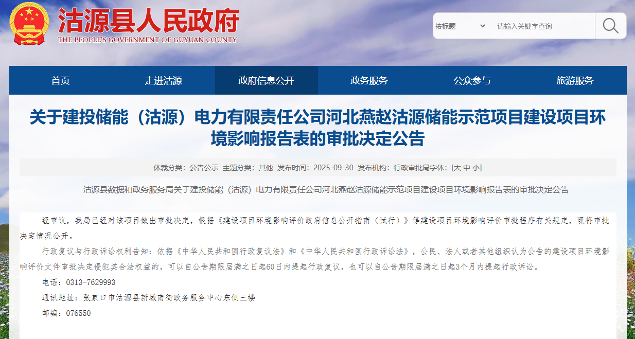 北极星储能网获悉,9月30日,沽源县人民政府发布《关于建投储能(沽源)电力有限责任公司河北燕赵沽源储能示范项目建设项目环境影响报告表的审批决定公告》。项目建设单位为建投储能(沽源)电力有限责任公司,项目选址于河北省张家口市沽源县西辛营乡,投...