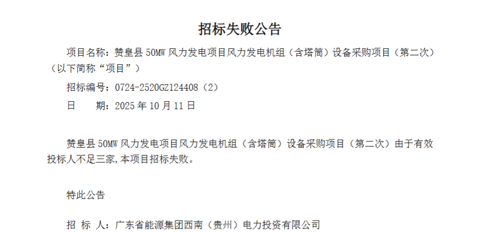 北极星风力发电网获悉,近日,中国招标投标公共服务平台发布《赞皇县50MW风力发电项目风力发电机组(含塔筒)设备采购项目(第二次)招标失败公告》。公告显示,由于有效投标人不足三家,该项目招标失败。赞皇县50MW风力发电项目位于河北省石家庄市赞...