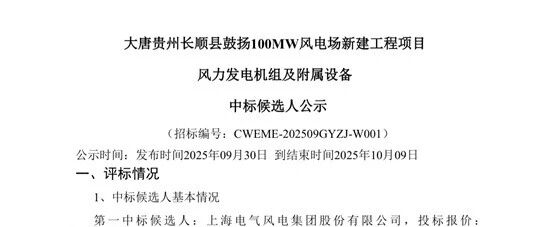 近日,大唐贵州长顺县鼓扬100MW风电场新建工程项目风力发电机组及附属设备公开招标结果公告,显示电气风电成功中标该项目,将为其提供陆上卓越平台机组,双方在风电领域的合作得以持续拓展与加深。电气风电与大唐集团已有十余年的合作历史,有着深厚的合...