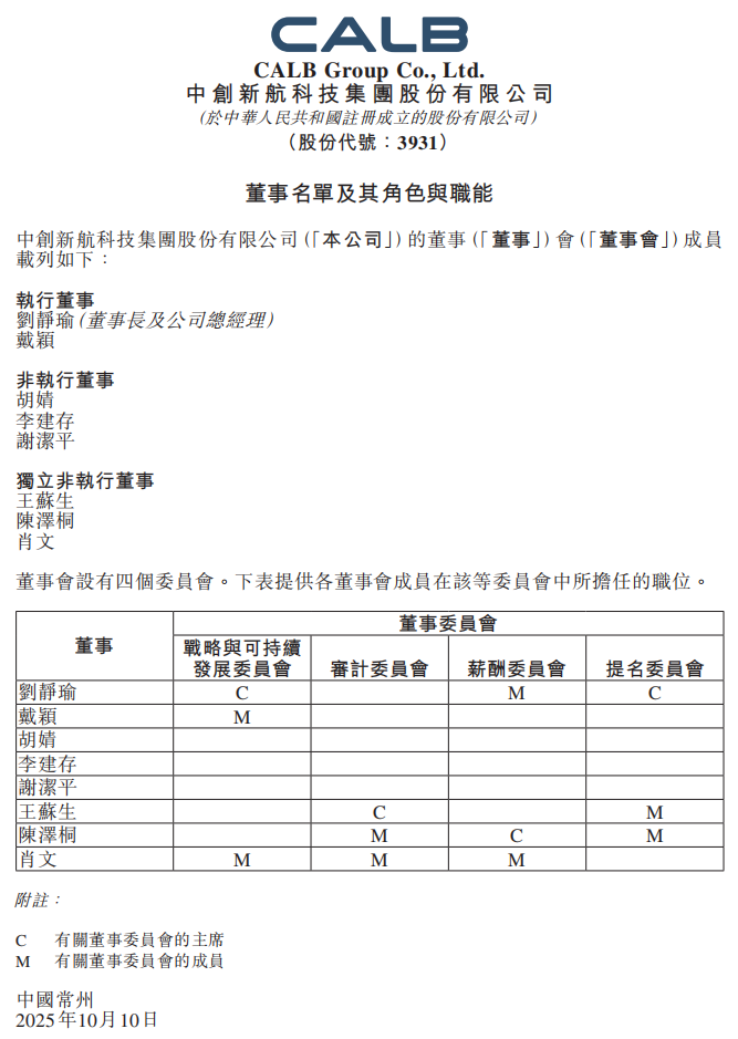 北极星储能网获悉,10月10日,中创新航发布重磅公告,更新董事会名单,并新增战略与可持续发展委员会。9月16日中创新航曾发布公告称,公司独立非执行董事吴光权因个人工作调整原因申请辞去董事会独立非执行董事职务,同时一并辞去薪酬委员会主席、提名...