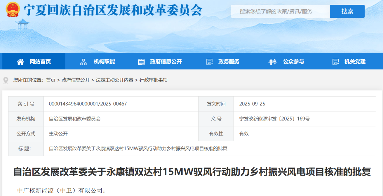 近日,宁夏回族自治区发展和改革委员会发布《关于永康镇双达村15MW驭风行动助力乡村振兴风电项目核准的批复》。中广核新能源(中卫)有限公司:报来《中卫市沙坡头区发展和改革局关于核准永康镇双达村15MW驭风行动助力乡村振兴风电项目进行核准的请示...