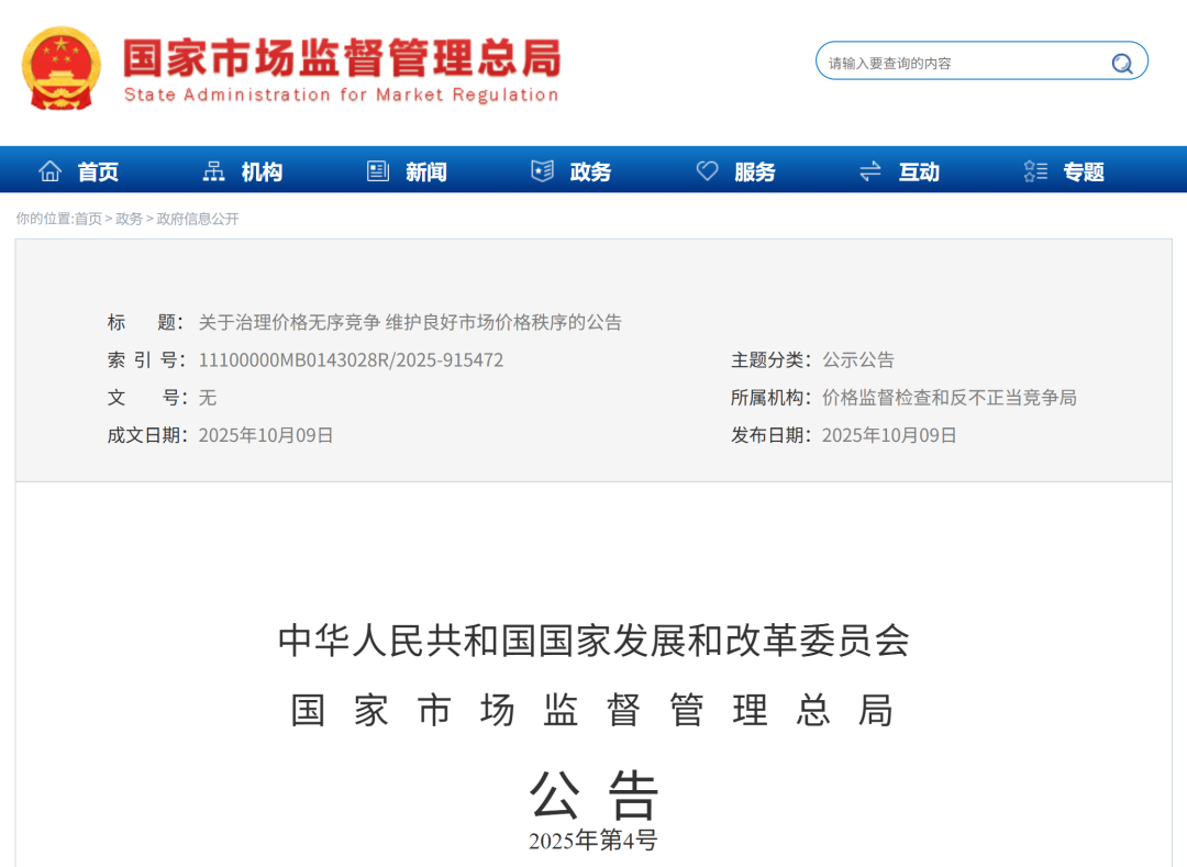 10月9日,国家发展改革委、市场监管总局发布《关于治理价格无序竞争维护良好市场价格秩序的公告》。公告提出,价格竞争是市场竞争的重要方式之一,但无序竞争会对行业发展、产品创新、质量安全等造成负面影响,不利于国民经济健康发展。公告根据现行法律法...
