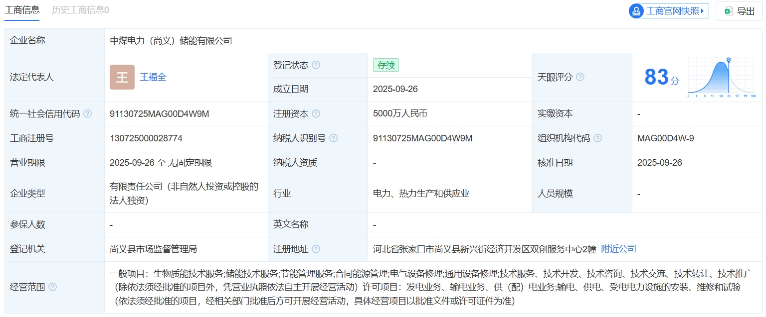 北极星储能网获悉,9月26日,中煤电力(尚义)储能有限公司注册成立,这也意味着中煤集团的储能企业再添一员。天眼查显示,中煤电力(尚义)储能有限公司注册资本5000万元,为中煤电力有限公司100%控股子公司,注册地址位于河北省张家口市尚义县,...