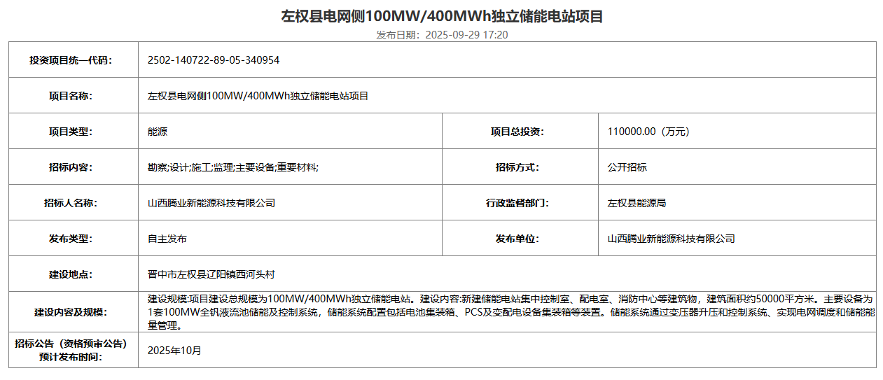 北极星储能网获悉,9月29日,山西腾业新能源科技有限公司发布左权县电网侧100MW/400MWh独立储能电站项目的招标预公告,预计发布时间为10月。项目总投资110000.00(万元),约合2.75元/Wh。建设规模:项目建设总规模为100...