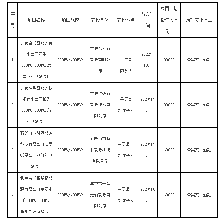 北极星储能网获悉,9月29日宁夏石嘴山平罗县审批服务管理局发布废止新型储能项目的公告,共废止4个储能项目,共计800MW/1600MWh,废止原因为备案文件逾期。原文如下:平罗县审批服务管理局关于废止新型储能项目的公告为推动我县新能源产业高...