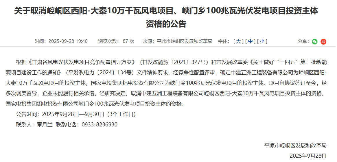 北极星风力发电网获悉,近日,平凉市崆峒区发展和改革局发布关于取消崆峒区西阳-大秦10万千瓦风电项目、峡门乡100兆瓦光伏发电项目投资主体资格的公告。公告指出,经竞争性配置评审,确定中建五洲工程装备有限公司为崆峒区西阳-大秦10万千瓦风电项目...